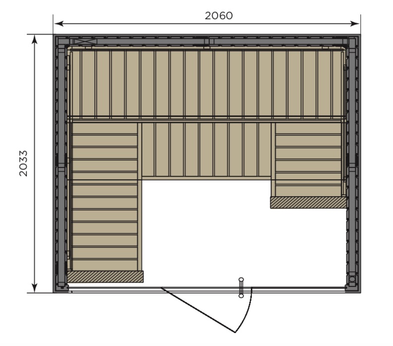 Die Bänke sind aus hellem Espenholz gefertigt, das einen schönen Kontrast zu den schwarzen Paneelen bildet. Espe ist das ideale Material für die Sauna, da die Bänke nicht zu heiß werden.