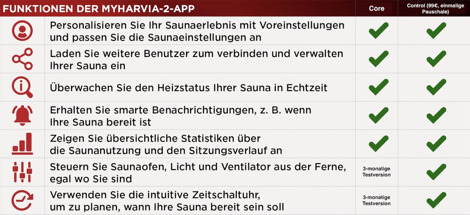 Mit der Core-Stufe erhalten Sie eine solide Grundlage zum Nulltarif. Bei der Control-Stufe handelt es sich um ein optionales, einmaliges Upgrade, das Ihr Saunaerlebnis wirklich perfektioniert. Wenn die Control-Stufe aktiviert ist, verwandelt sich Ihre App von einem Monitor in eine vollwertige Fernbedienung – Sie können Ihre Sauna von überall und jederzeit mit nur einem Fingertipp starten.