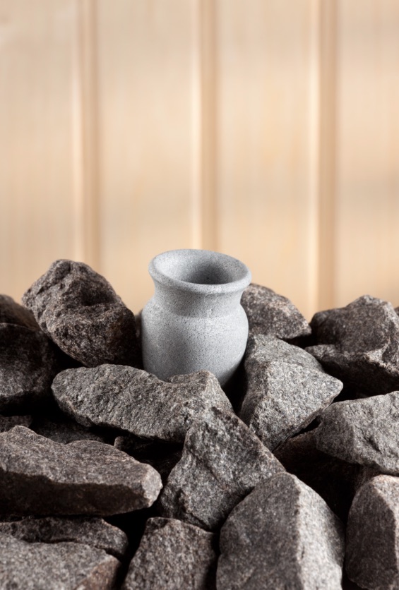 - Die Dufttasse aus Speckstein wird in die Mitte der Saunasteine plaziert