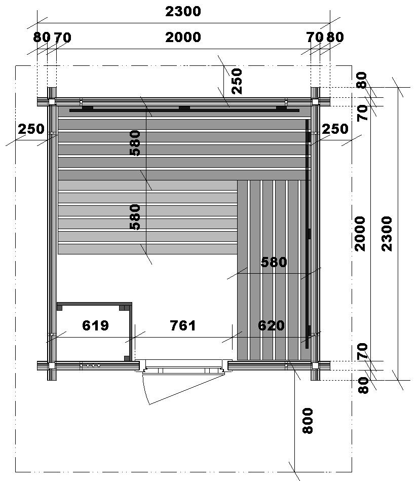 - Außenmaß mit Ecküberstand: 2300 x 2300mm