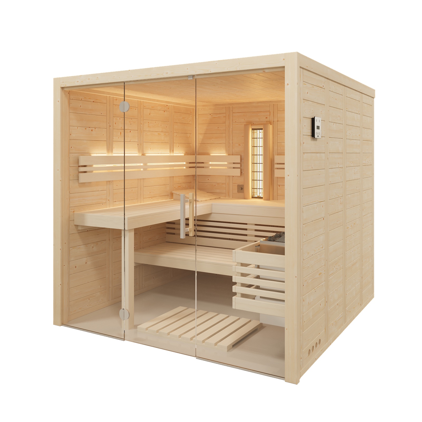 - Massivholzsauna aus 40 mm nordische Fichte in flächenbündiger Kassettenbauweise