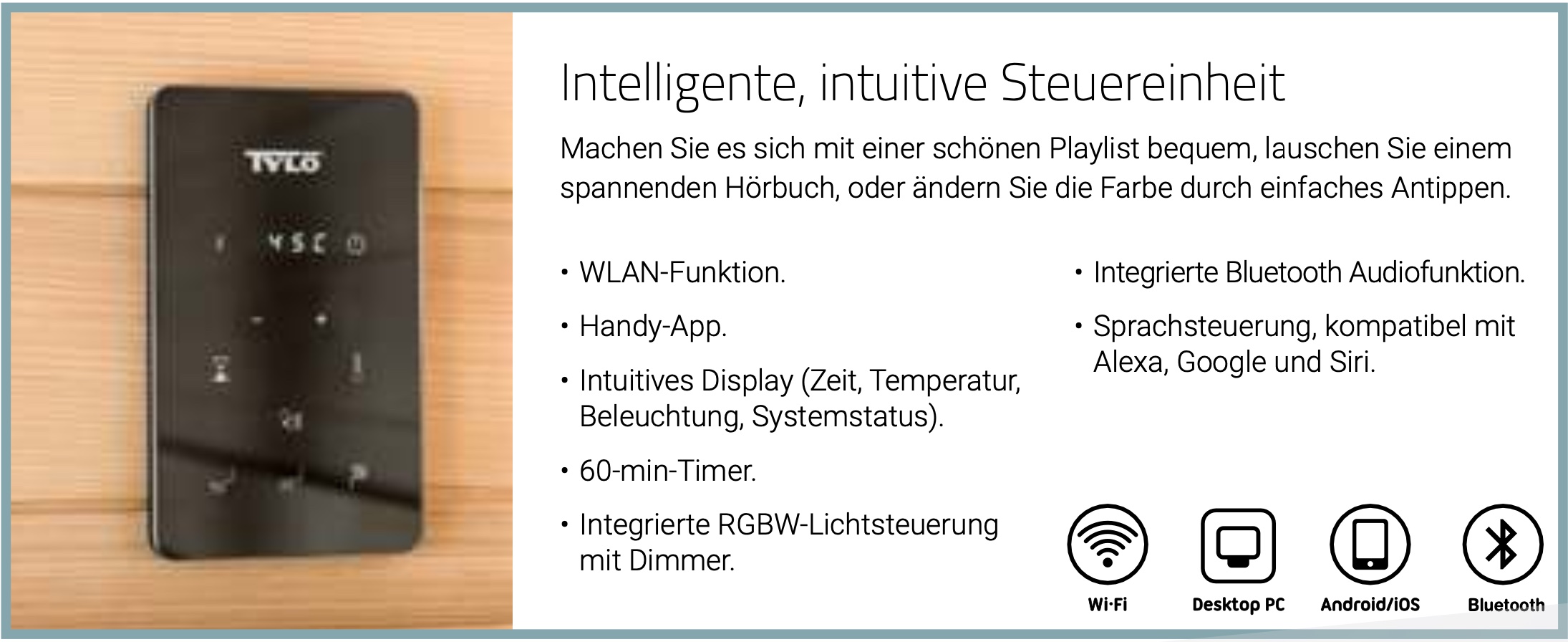 - Steuerung: Eingebautes Touch-Bedienfeld sowie über Smartphone/SaunaLogic-App