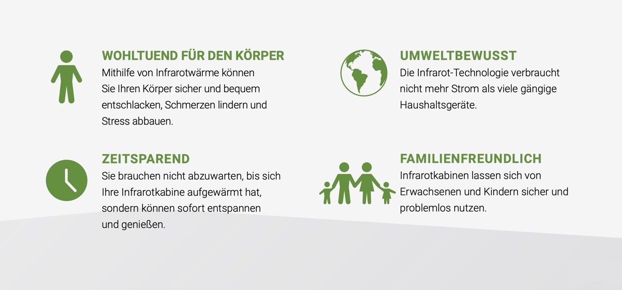 Eine Infrarotkabine erzeugt Wärme mithilfe von Infrarotstrahlen, die direkt tief in den Körper eindringen, ohne dabei die Umgebungsluft zu erwärmen. Dadurch schwitzen Sie in einer Infrarotkabine schon bei niedrigeren Temperaturen. Vom tiefenreinigenden Detox-Schwitzen über Schmerzlinderung bis hin zu weniger Müdigkeit und besserem Schlaf bietet eine Infrarotkabine zahlreiche Vorteile für Ihre Gesundheit.
