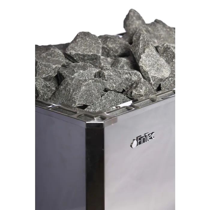 Entdecken Sie den hochwertigen FinTec Elektro-Saunaofen ARNE mit einer Verblendung aus poliertem Edelstahl, perfekt für gewerbliche Fitnessstudios und kleinere Saunen.