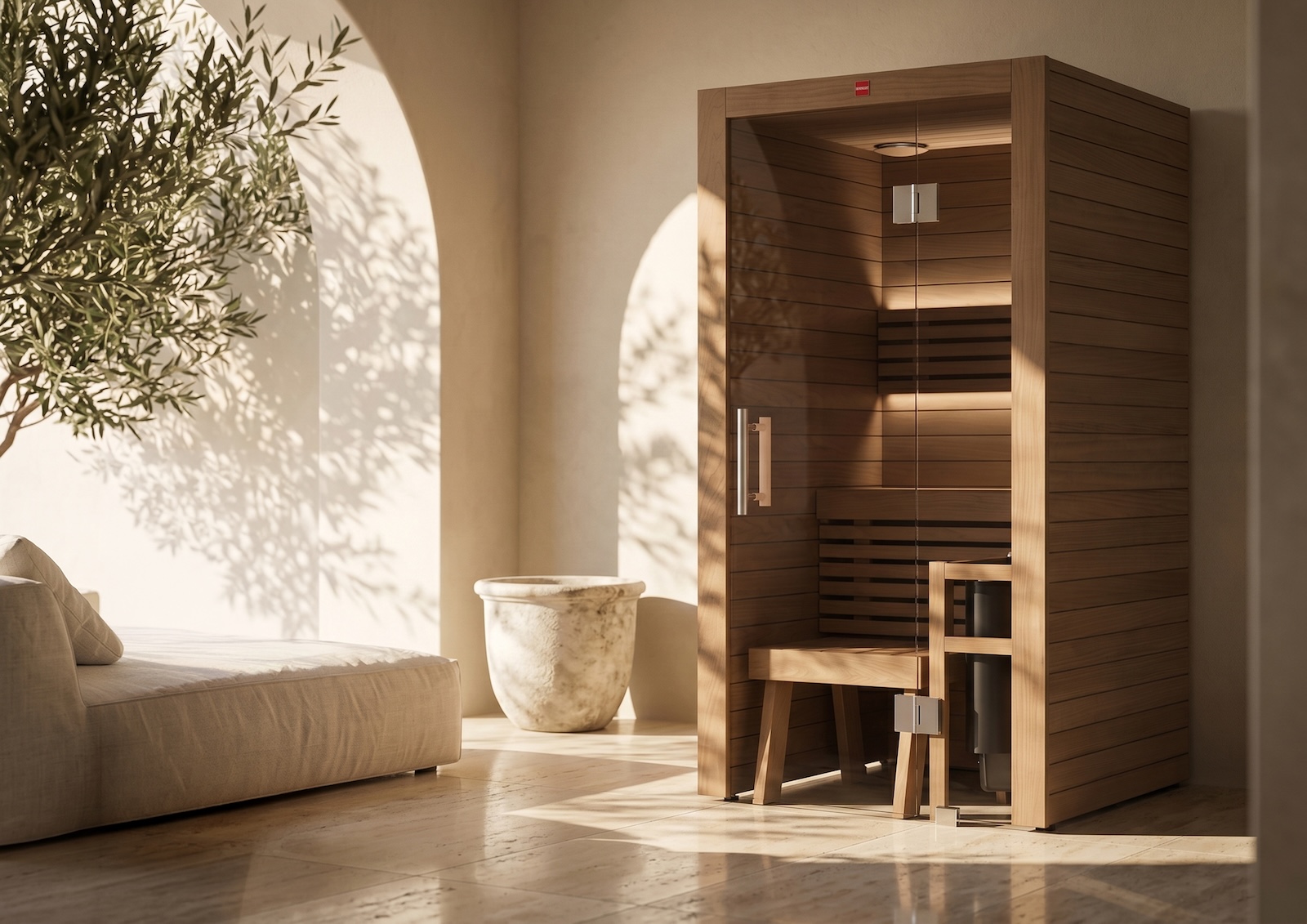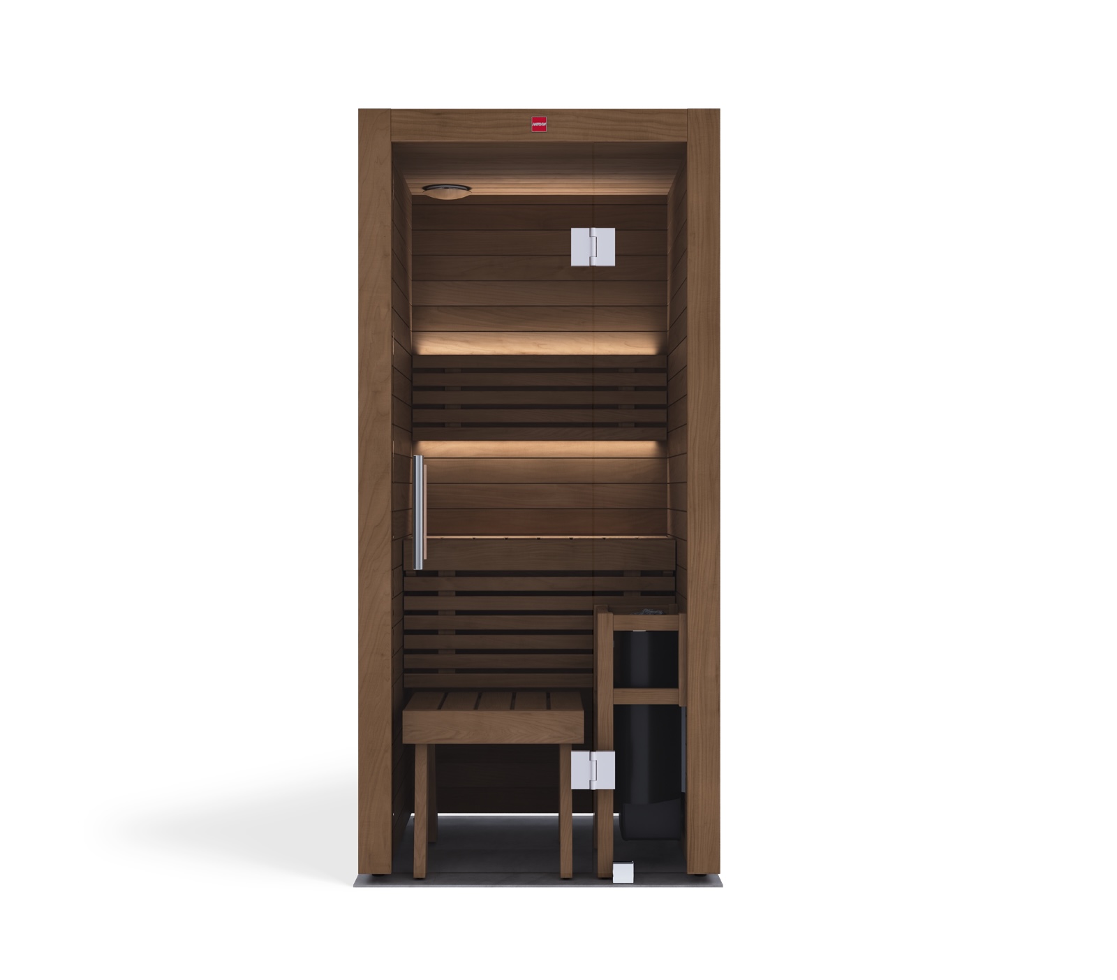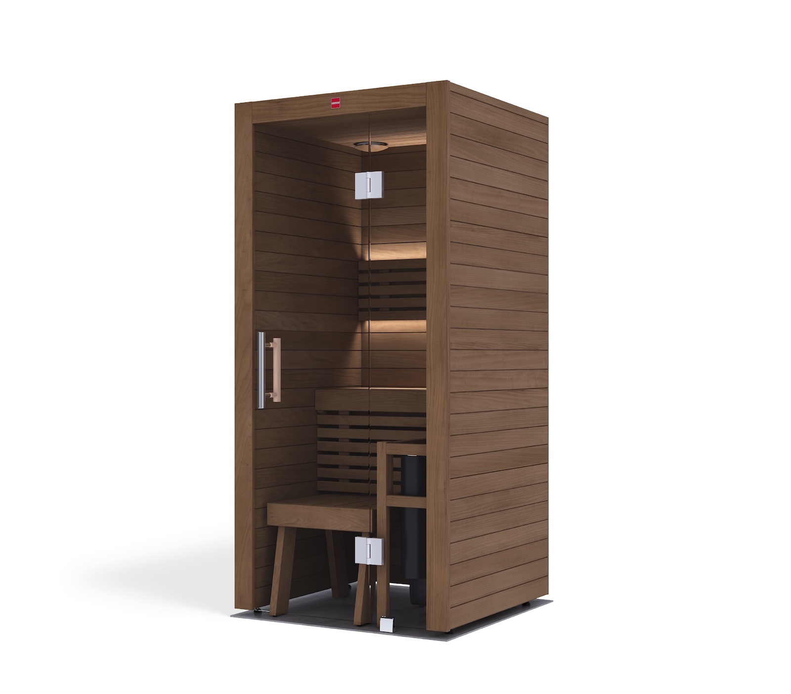 Die rückwärtige Bankanordnung ist einfach und effizient gestaltet und bietet Platz für eine Person. Alle Holzoberflächen sind knotenfreie Premiumqualität, speziell für die Sauna behandelt und frei von schädlichen Zusätzen.