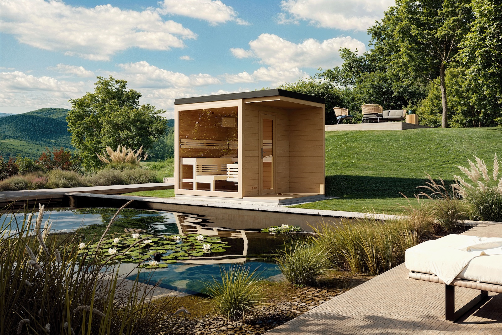- Flachdach mit Dachbahn, Dachschalung aus 18 mm Holzdielen und Giebelblende aus Holz