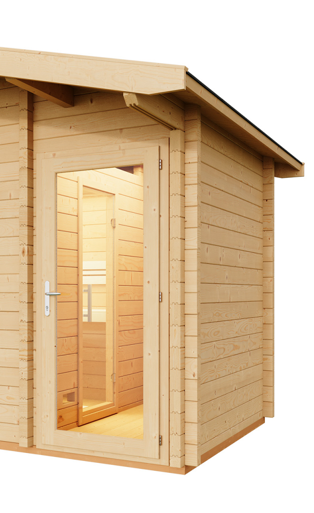 - Saunafenster feststehend: 1040 x 540 mm, Isolierglas (Größeres Fenster oder Panoramafenster optional gegen Aufpreis erhältlich!)