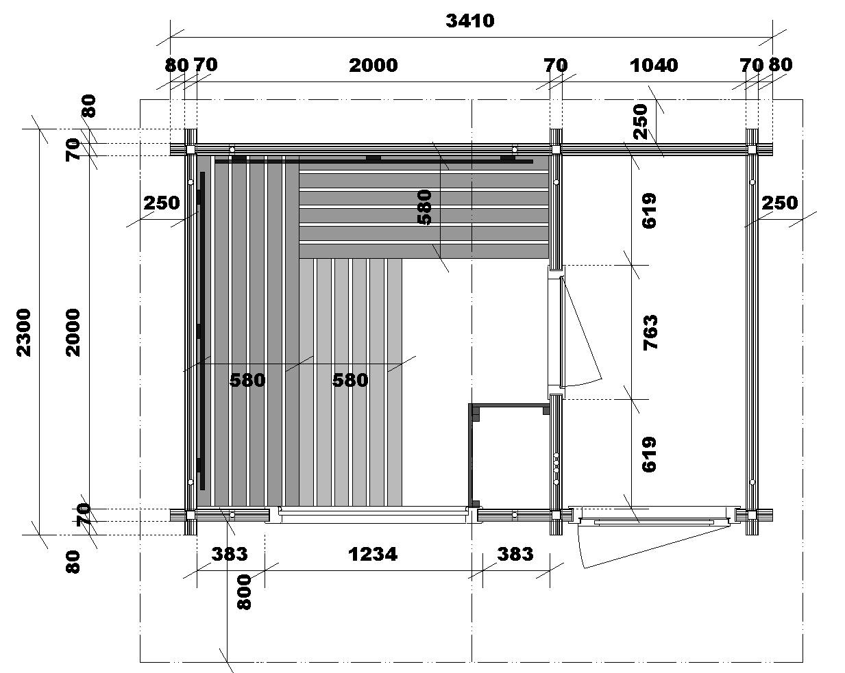 - Außenmaß mit Ecküberstand: 3410 x 2300 mm