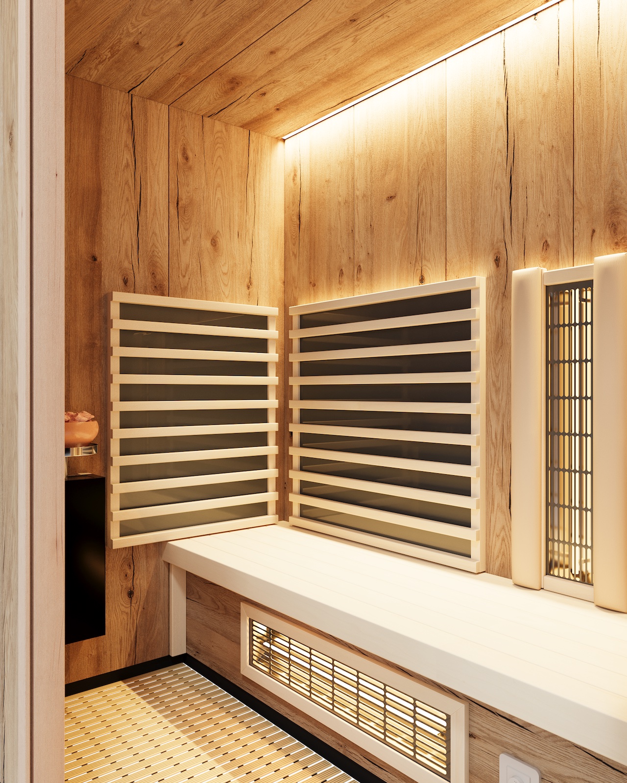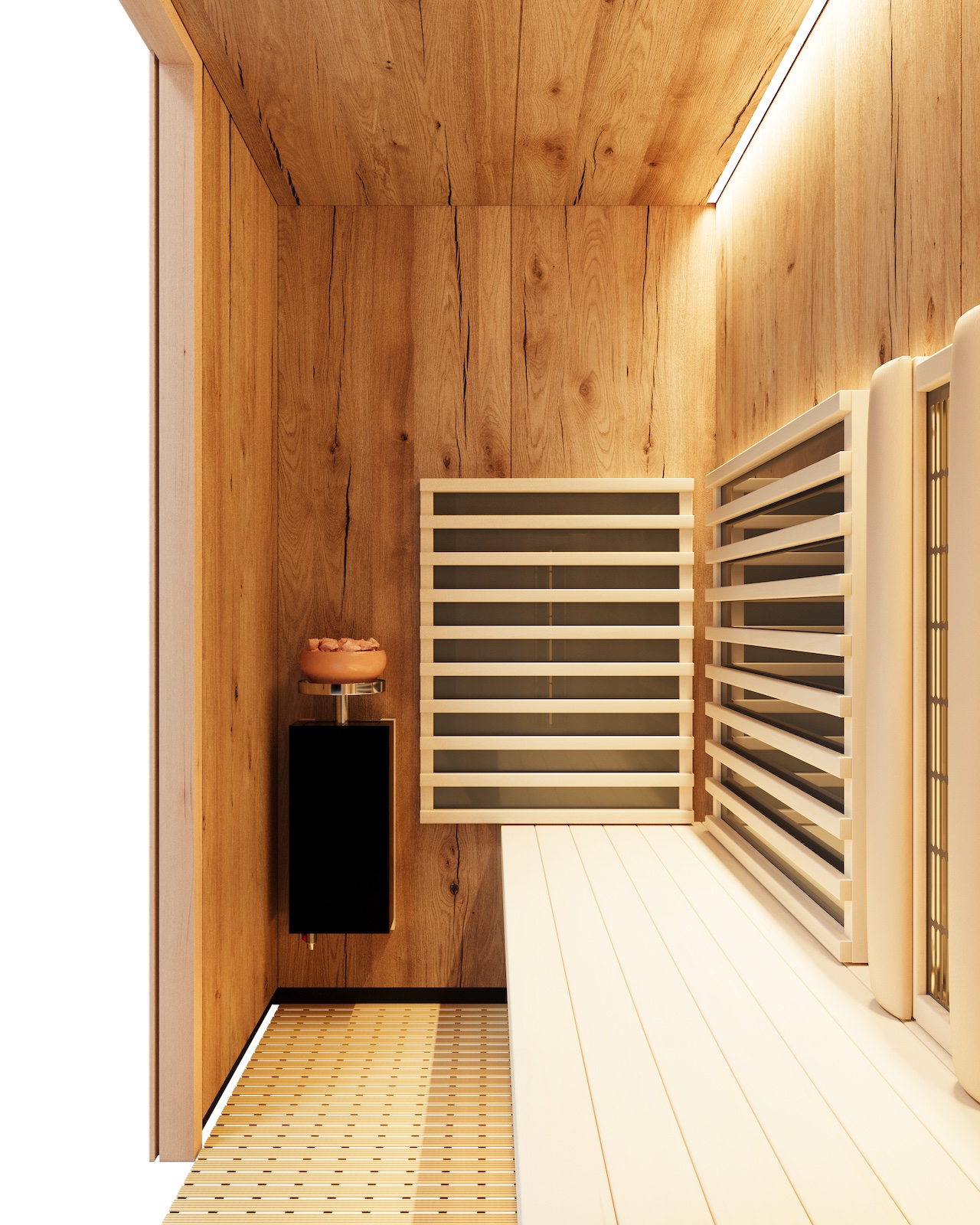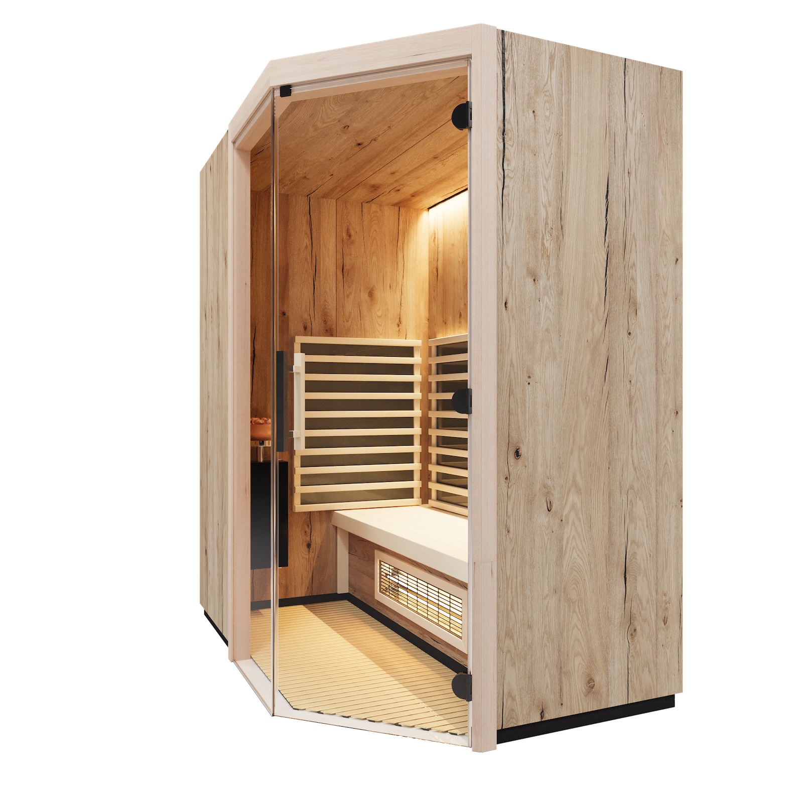 - Saunapaneele wahlweise in Ahorn, Eiche alt, Hemlock und Zirbe