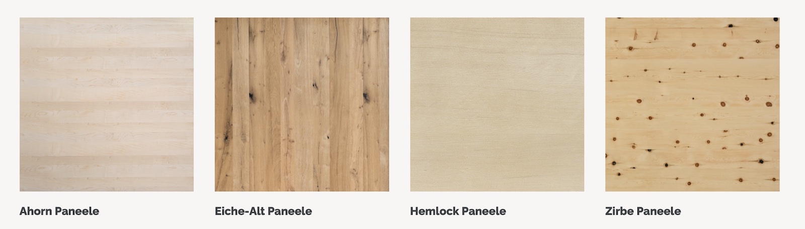 Zur Auswahl stehen außerdem die Holzarten Ahorn, rustikale Eiche alt, Hemlock und österreichische Alpen-Zirbe.