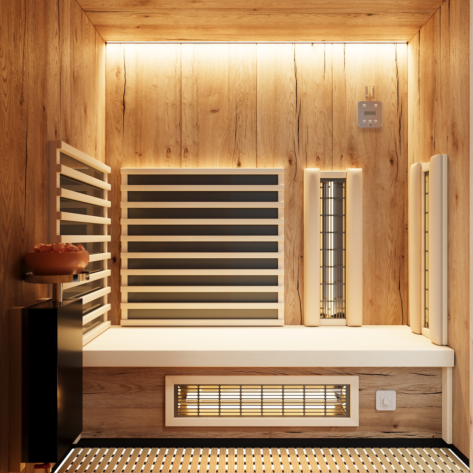- Heizelemente: digital von Innen regelbar, VITALlight-Strahler und Flächenheizung sind dimmbar