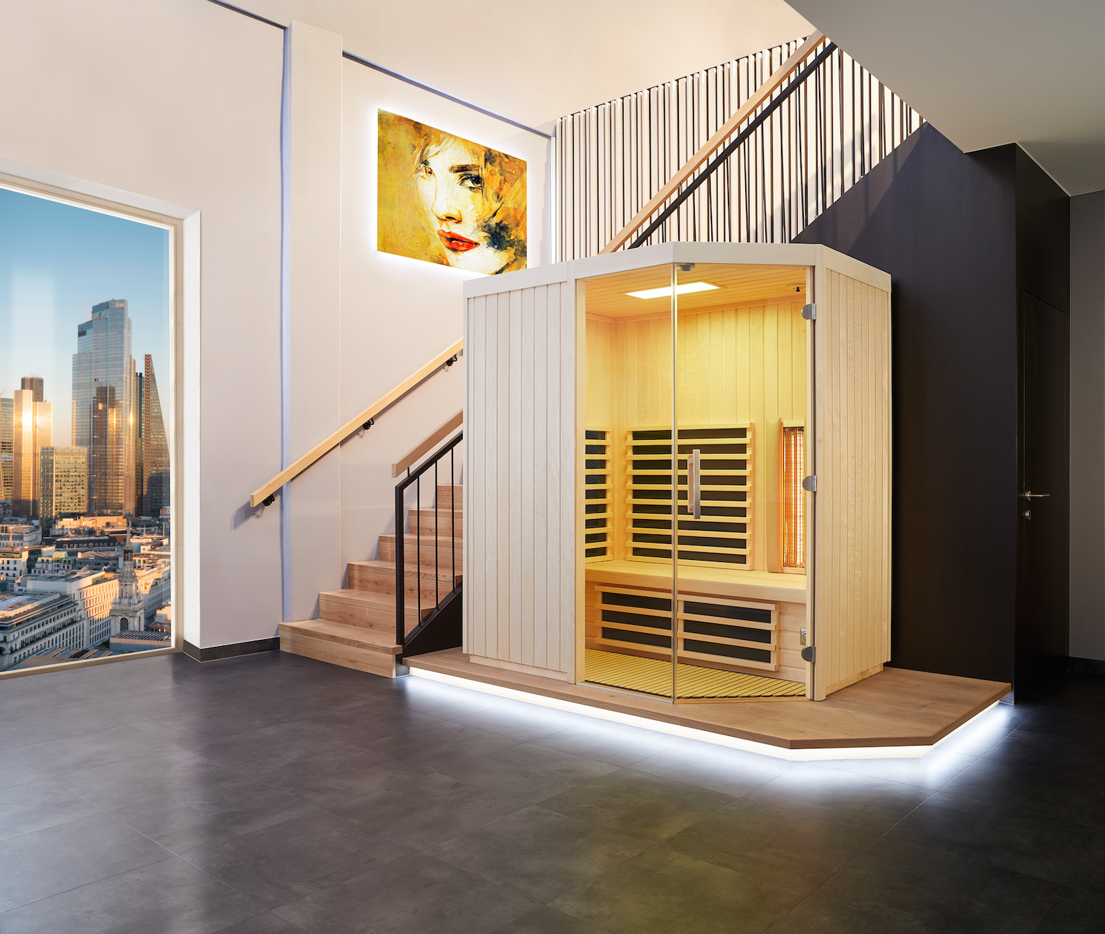 Die TrioSol-Infrarotkabine vereint drei verschiedene Elemente und sorgt für ein absolutes Wohlfühlambiente. Die Flächenheizung spendet behagliche Wärme. Der VITALlight-Strahler bietet ein ähnliches ABC-Infrarotspektrum wie die Sonne und verwöhnt Haut, Blutgefäße und Muskulatur mit einer intensiven, punktuellen Bestrahlung. Für salzhaltigen Wasserdampf in der Luft sorgt die exklusive Sole-Therme. Mit dem ausgeklügelten Steuersystem können Sie alle Module stufenlos und individuell dosieren.