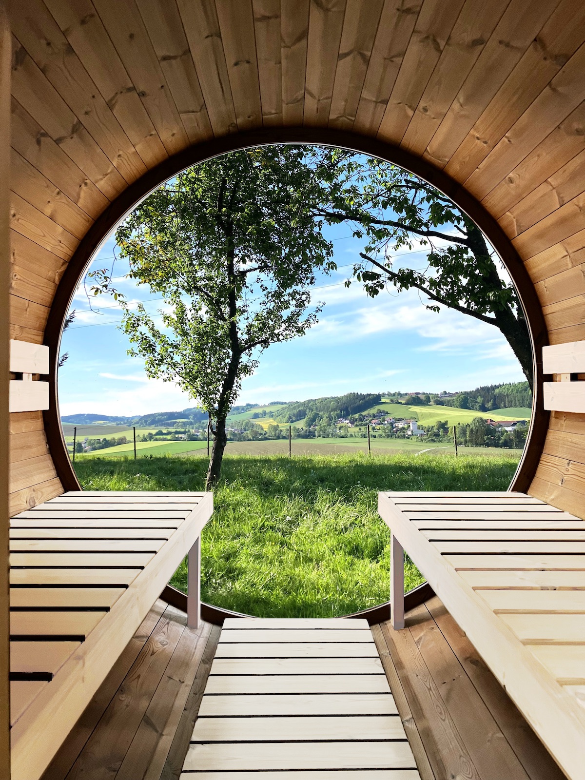 Mit der modernen View Fasssauna "Kaski" holst du das finnische Saunaerlebnis zu dir nachhause. Dank der natürlichen Form fügt sich das Fass in jeden Garten ein und bietet Platz für bis zu 6 Personen. Durch den kompletten Glasausschnitt auf der Rückseite wirkt das Fass nicht nur deutlich größer, es bietet Ihnen auch eine schöne Sicht nach draußen. Das Thermo-Kiefernholz und die Schindeln aus Bitumen machen die Gartensauna ideal für den Außenbereich. Im Lieferumfang ist ein weißes LED Licht für einen angenehmen entspannenden Saunagang enthalten.