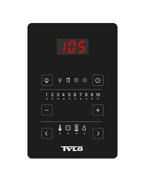 Bedienen und überwachen Sie Ihre Sauna mit dem thermostatgeregelten Steuergerät Pure. Das dünne schwarze Bedienfeld leuchtet bei Berührung auf und ermöglicht die einfache und schnelle Einstellung von Beleuchtung, Temperatur und Saunazeit.